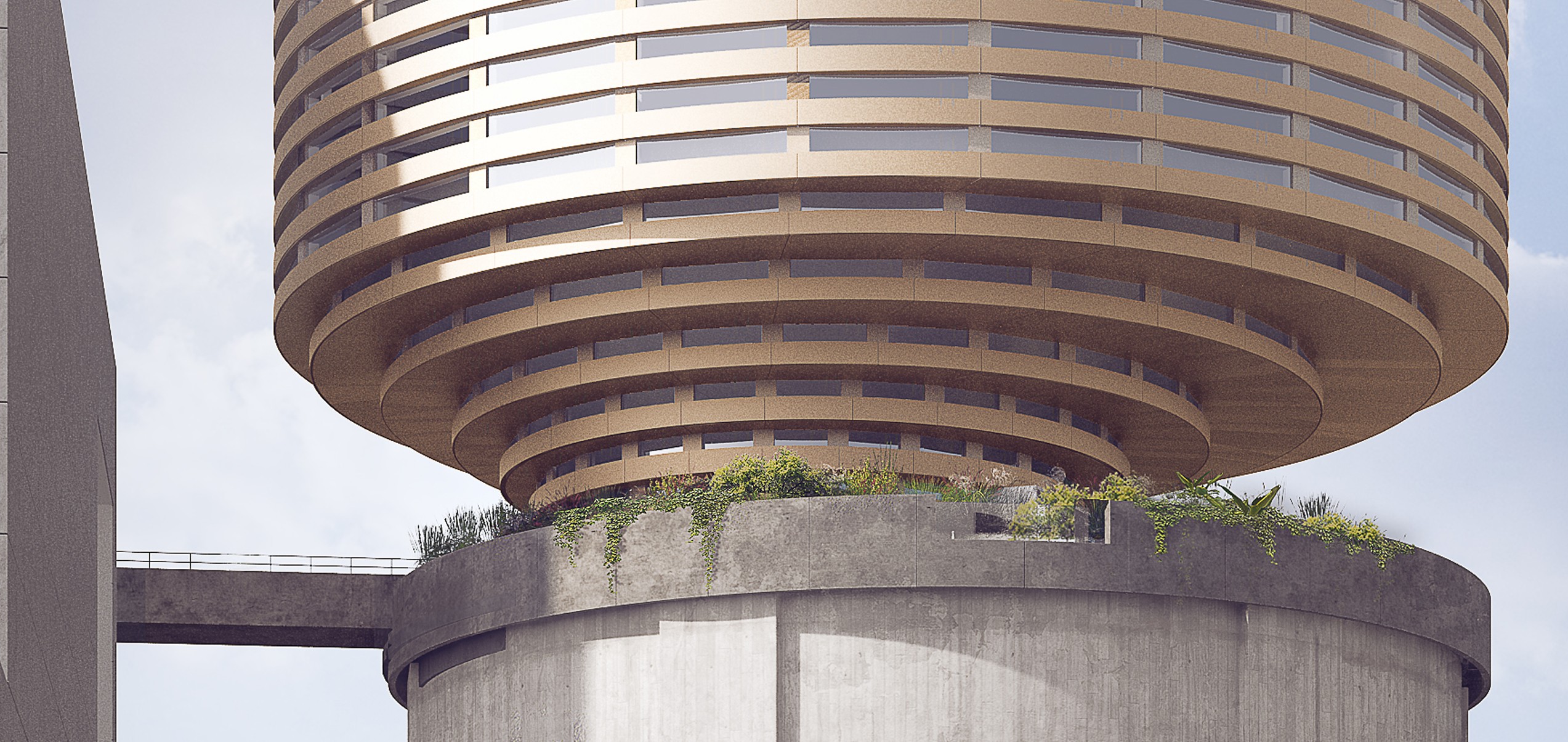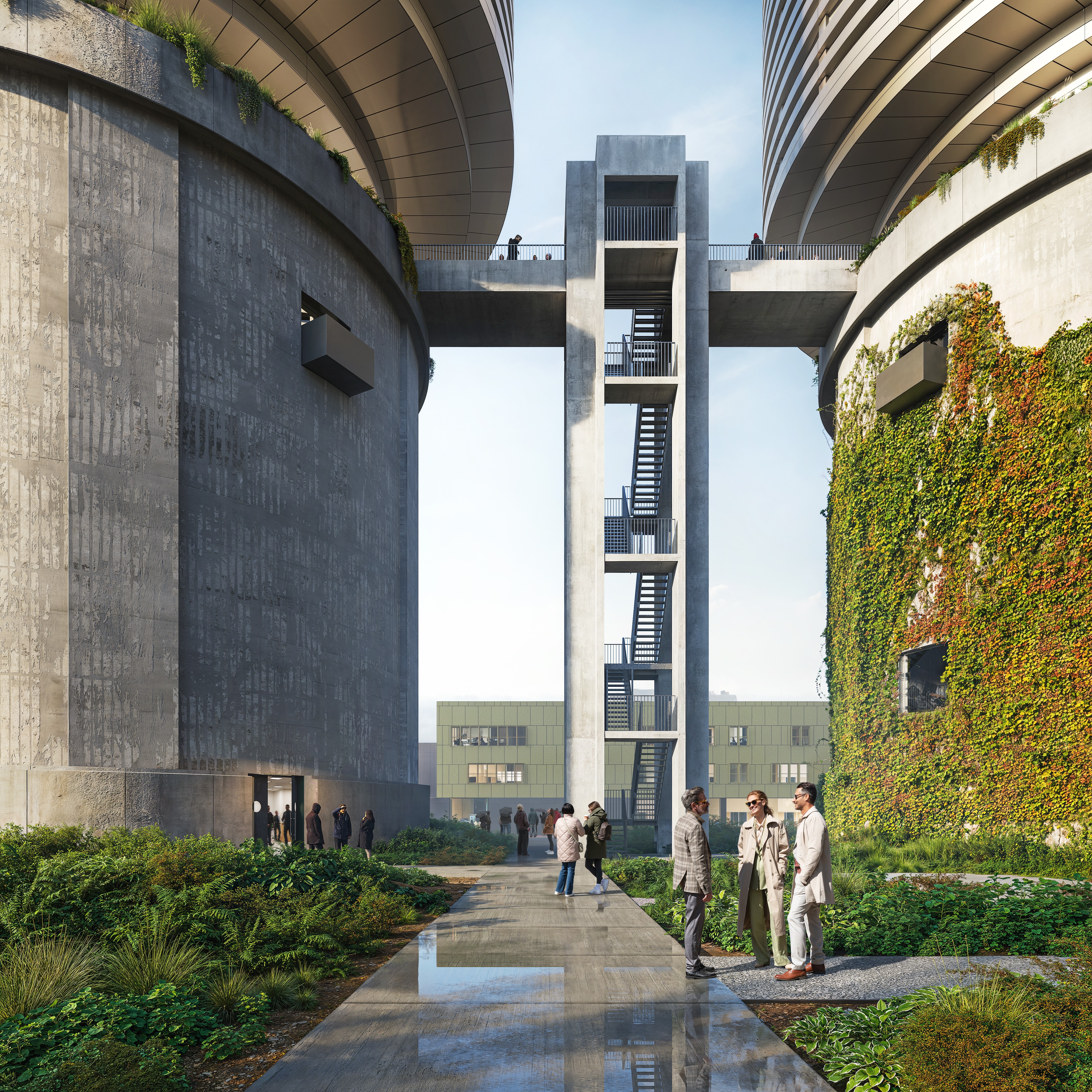 Drie nieuwe kantoortorens verrijzen uit de oorspronkelijke silo's — licht, efficiënt en verbonden met alles daaronder.
